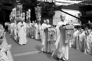 7:50,迎請法會結束,棲霞寺住持隆相法師跪拜之后,小心翼翼地捧起了錦盒,向朝天宮的東門走去,傳義和曙光兩名法師隨行兩側護衛。