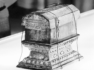 記者看到,整個(gè)啟請過程中稍微有點(diǎn)難度的就是須彌座的長方形金棺銀槨。這套金棺銀槨長和高約為15厘米,寬約六七厘米,槨蓋上有細(xì)密的花紋,前頭還垂下了兩重屋檐。槨身四周有持金剛杵的天王或力士站在門前,代表天龍八部,即佛祖的護(hù)衛(wèi);還有吹笛和排簫的天女天象,衣帶飄飄仿佛凌空飛行。須彌座是由佛座演變來的,這個(gè)銀槨的造型明顯寓意佛祖居住的宮殿。銀槨內(nèi)是一個(gè)小一號的金棺,用金絲捆扎,防止棺蓋滑脫。現(xiàn)場,專家們用手輕輕“推”著捆綁的金絲,沒用幾分鐘,就解開了千年謎底,露出了里面的佛頂真骨。