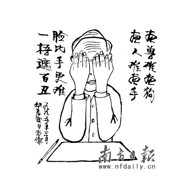 廖冰兄有一幅著名的漫畫《自嘲》,辛辣刻畫了一些人在“甕破”之后仍然瑟瑟發抖的形象。華君武也有一幅《自畫像》,但畫中人卻沒有露出面孔,華君武這樣風趣地自嘲說:“我是畫不了素描的嘛,當然也就畫不了自畫像。怎么辦?只好畫了一個人,雙手緊緊地把臉捂住!