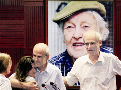 當(dāng)北京外國語大學(xué)離休教授、90歲的老專家伊麗莎白來到現(xiàn)場后,寒春最小的外孫女走上前擁抱,一老一少相擁而泣。