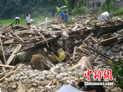 中新網河池8月4日電 (羅開革 王剛)廣西河池市鳳山縣公安局4日上午透露,該縣3日發生大面積山體滑坡事故,上萬立方的泥土和石頭摧毀了5間民房。所幸房內人員及時逃生,沒有造成人員傷亡。