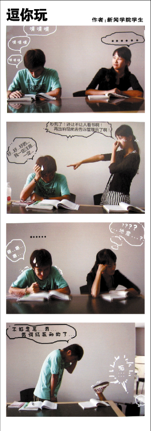 何謂真人四格漫畫?就是每一格分別突顯開頭、發展、高潮和結尾以表現一個簡單而充滿寓意故事。此前在網絡上以真人漫畫一炮走紅的是“非常真人”組合,現在華工校園到處活躍著這樣的“非常真人”。