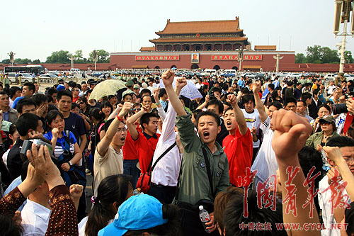 5月19日下午,天安門廣場上聚集了數(shù)萬名參與哀悼活動的群眾,在默哀完畢后,此起彼伏的“中國萬歲”、“中國加油”的聲音響徹云霄。幾名四川籍在京大學(xué)生用四川話激昂高呼“四川雄起”,在場的四川人奮起響應(yīng),很快,來自全國各地的人們都受到強(qiáng)烈的震動,一起吶喊起來,一聲聲感人肺腑的吶喊聲在天地間回蕩,一雙雙舉著國旗的手臂在廣場上有力的揮舞,廣場漾起了一片血色的愛國暖潮。