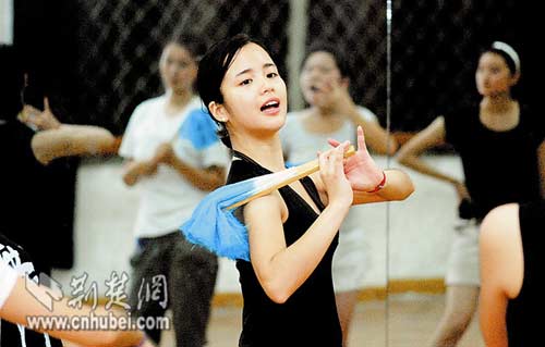彎腰,擺頭,腳尖點(diǎn)地,滑步……伴著古意濃濃的音樂(lè),七名女孩翩翩起舞,優(yōu)美的身姿讓人的目光不禁久久停留。“這不是‘魔女幼熙’么?”記者眼前一亮:領(lǐng)舞者長(zhǎng)相頗似熱播韓劇《魔女幼熙》的主角。隨意的小卷發(fā)披在肩頭,忽閃忽閃的長(zhǎng)睫毛下,大眼睛顧盼生輝,這個(gè)“魔女幼熙”名叫黃蓓,武大新聞與傳播學(xué)院大三學(xué)生。每晚給一群將參加“藝考”的高中生上舞蹈課,是她這個(gè)暑假的兼職工作。“看清楚啊,像我這樣,兩手伸直,腰一定要用力彎下去……”從學(xué)生的熱身準(zhǔn)備,到舞蹈中的每個(gè)細(xì)節(jié)乃至眼神,黃蓓都頗為專(zhuān)業(yè)地逐個(gè)糾正。兩小時(shí)的教學(xué)時(shí)間里,她說(shuō)得最多的一句話是“再來(lái)一遍”。在幫助學(xué)生做拉伸動(dòng)作時(shí),有的初學(xué)者疼得哇哇叫,她也毫不心軟,“怕疼是學(xué)不好舞蹈的。”