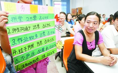 “學(xué)生的眼真毒!太嚴(yán)厲、拖堂、扔粉筆頭,好像我可以對(duì)號(hào)入座啦!”根據(jù)學(xué)生羅列的一堆毛病,一位女老師大吃一驚。“平時(shí),我真沒(méi)發(fā)現(xiàn)自己多厲害,現(xiàn)在聽(tīng)你們一說(shuō),真覺(jué)得有時(shí)不該發(fā)火。”二年級(jí)語(yǔ)文老師樊偉說(shuō)。