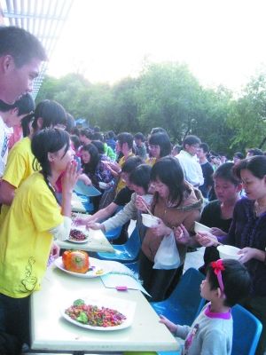 現場烹飪比賽結束后,各參賽隊伍把自己的成品展示在一排長長的桌子上。現場學生排起了數十米長的隊伍,人手一只碗,一雙筷,擺好陣勢沖著美食長龍開始了“掃蕩”!捌呃镲h香”雞翅,“盛世金蘭”南瓜煲......各位學生大廚一邊介紹一邊拉票,場面熱鬧非凡。 (記者 薛冰 實習生 林珍 通訊員 何淑賢)