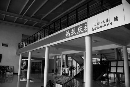 昨天下午,記者來到位于寧波市環(huán)城北路的教育學(xué)院。走進(jìn)教學(xué)樓大廳,正上方鑲嵌著一塊大約十來米長,半米寬的電子顯示屏,屏幕的右邊則鑲嵌著 “二00九屆高職全體畢業(yè)生贈(zèng)”的金字。