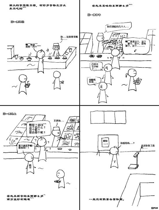 “很有生活氣息啊。樓主MM這一個(gè)月活得比我們4年還精彩啊。”網(wǎng)友直言,貼近生活的漫畫(huà)看起來(lái)輕松愉快,細(xì)細(xì)瀏覽,還會(huì)想起自己曾經(jīng)的菜鳥(niǎo)生活,“剛來(lái)紫金港的時(shí)候,我也幾乎天天迷路”,“想起自己剛進(jìn)大學(xué)的時(shí)候,也是對(duì)什么都好奇啊!