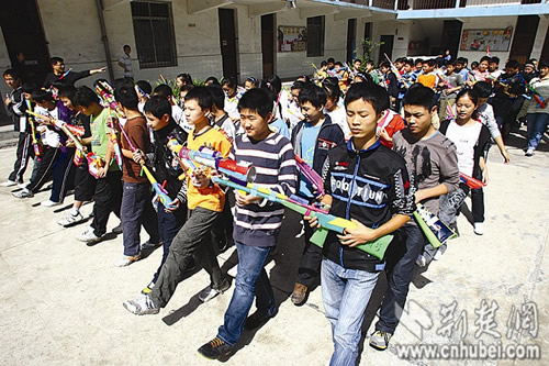 荊楚網(wǎng)消息 (楚天都市報) (記者張皓 攝影:記者魏錸)昨日下午,武漢市第59中學(xué)上百名學(xué)生,手持各式“槍支”在學(xué)校操場上走正步,體驗(yàn)“閱兵”的感覺。據(jù)介紹,該校最近嘗試新課改,將美術(shù)課與軍訓(xùn)、體育鍛煉結(jié)合進(jìn)行,這些槍支是在近兩個星期的美術(shù)課上,同學(xué)們利用紙盒等廢棄物自己動手制作的。