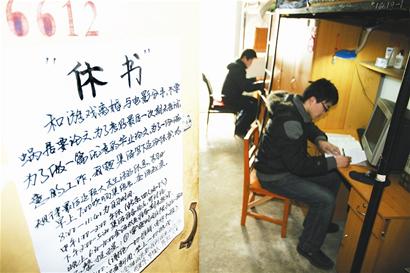 寢室長付寅解釋說,“休”一是指要合理安排休息時間,請同學們少串門;二是指改掉平時愛看電影、愛玩游戲的“惡習”。“海報很張揚,主要是為了吸引同樓同學的注意。我們的大學生活時間所剩不多,我出這個點子,也是想讓大家監督我們的行為”。海報上還寫明了一天的作息時間。為表決心,“休書”最后還有寢室全體成員簽名。