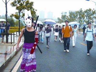 隨后,羅果找同學(xué)借來面具和忍者刀,找球迷們借了足球襪,又拿出老鄉(xiāng)送自己的娃娃,這樣就搭配出一身獨特裝扮。他大概在校園走了半個小時,引起了不小的轟動。最后,同學(xué)履約——請他到校外餐館撮了一頓。