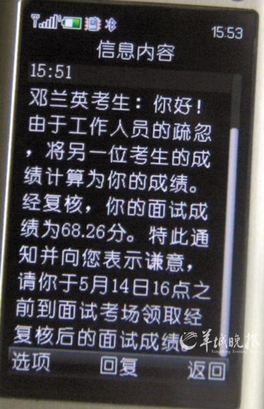鄧蘭英稱,當天下午約1時30分,她進入考場(注:考前一小時考生封閉抽簽確定考試順序,真正開考是2時30分),她是第二個進入考室的,前后面試了約10分鐘。“面試完后,發給我的面試通知書上的成績為78.17分。我離開考場大約40分鐘后,有人自稱考試工作人員給我來電說:因工作人員疏忽把我的分數搞錯了,叫我速回考場拿第二份成績。大概30分鐘左右,對方又用移動電話發來短信說:“×××考生,由于工作人員的疏忽,將另一位考生的成績計算為你的成績。經復核,你的面試成績為68.26分。請你在5月14日16點之前到面試考場領取經復核后的面試成績。”