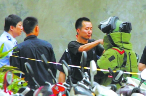 通盛嘉苑交通監理公司門衛何金福老伯告訴記者,“炸彈”當時就裝在一個黑色紙袋子里,掛在考點外一樓的一根鋼管上,那是他的晾衣竿。