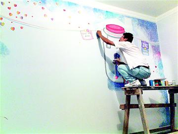 “傳統裝修視覺上平面、乏味,而墻繪卻可以營造出立體感,個性十足!笔袌稣{查后,陳斌決定創辦一個墻繪工作室,既能發揮自己的美術專業專長,又能實現創業夢想。同學武杰一拍即合,兩人果斷籌集了1萬元啟動資金,并邀請劉慧等3名女同學加入進來。今年5月17日,5位大學生的工作室正式成立。