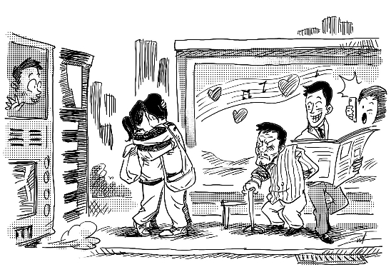 昨天本報熱線96068接到熱心讀者的來電,說在杭州天目山路八字橋車站每天下午5點半左右,經?匆娨粚χ袑W生戀人旁若無人地摟抱、接吻,一點也不顧忌周圍人的眼光,公交車來了也不上車。“他們每天都這樣,這個年紀應該學習要緊,你們記者去勸勸吧!”