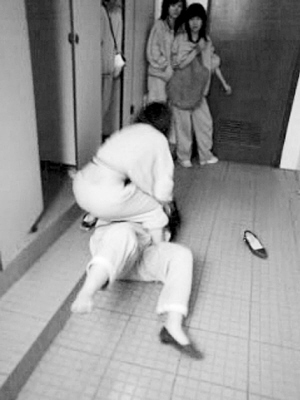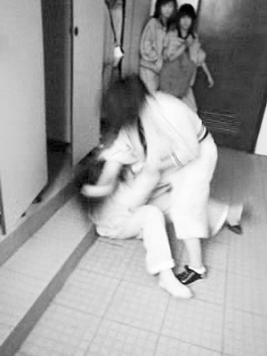 殷瓊是上海西南工程學校一年級學生。4月16日下午,她參加考試,題目差不多做完了,同學小成對她耳語:“下課去校門口,有人找你談話!币蟓倹]答應,小成幫她交卷,把她拉到校內一幢大樓2樓女廁所門前,那里還有幾個女生在等著。拉扯進廁所后,另一名同學劉幸一邊拍她肩膀挑釁,一邊讓其他女生打開手機攝錄。視頻記錄了殷瓊的噩夢,殷瓊的母親向記者出示了這段影像: