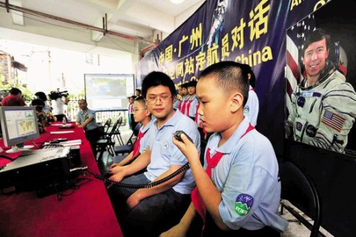 本報(bào)訊 記者蔡惠中攝影報(bào)道:昨日北京時(shí)間16時(shí)26分02秒,一個(gè)電波由廣州市同福中路第一小學(xué)的業(yè)余電臺發(fā)出,與正飛越廣州上空的國際空間站的電臺聯(lián)通上了!這也是我國小學(xué)生第一次舉辦的國際空間站業(yè)余無線電通訊計(jì)劃的活動。全程歷時(shí)8分30秒,學(xué)生們提出了20個(gè)問題。