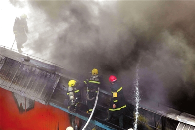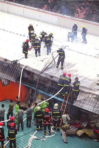 采石路消防中隊和首體南路消防中隊出動10輛消防車相繼趕到,消防員向屋頂噴水后,攀上樓頂鑿開屋頂彩鋼板向內噴水。很快,明火被撲滅。消防員需一人指引進入教室,小石便自告奮勇領路。小石說:“教室有一個籃球場大,里面有音響設備和椅子等物,當時屋內濃煙滾滾。”他隨即撤出,消防員繼續進行撲救。
