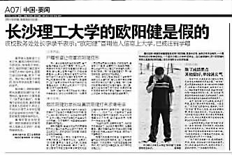 在長沙理工大學(xué)讀大三的“歐陽健”,在接受湖南媒體采訪時,也稱自己的成績和身份不假。26日,湖南某報推出跟蹤報道《長沙理工大學(xué)的歐陽健是假的》。報道稱,長沙理工大學(xué)教務(wù)處表示那里的“歐陽健”,冒用他人信息上大學(xué),已被取消學(xué)籍。