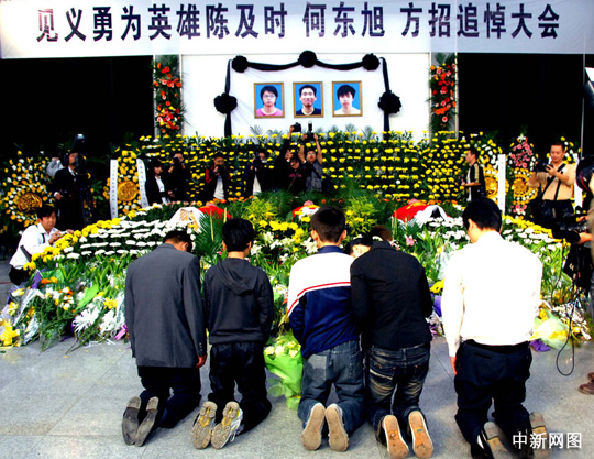 參加追悼會的還有荊州市教育局、民政局、團(tuán)市委、總工會、婦聯(lián)、見義勇為促進(jìn)會等有關(guān)單位負(fù)責(zé)人,長江大學(xué)師生、三位英雄生前親朋好友以及自發(fā)前來悼念的社會各界人士等。追悼會結(jié)束后,運(yùn)載三位英雄的欞車前往八嶺山火葬場。沿途,鞭炮聲不絕。荊州市民自發(fā)相送,把鮮花撒送在道路中。除開欞車和相關(guān)車輛,荊州的士司機(jī)也加入到送別英雄的行列之中,各種車輛延續(xù)近十里,送英雄最后一程。 (完)