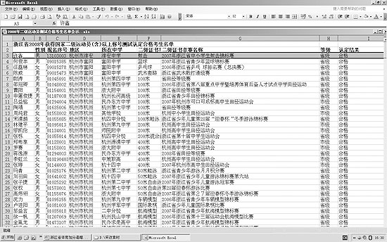 打開這個公示名單,前兩行的內(nèi)容分別是:“許鑫;性別:男;報名序號:13103003;地區(qū):杭州市淳安;所在中學:淳安中學;二級證書:射擊;二級證書競賽名稱:2007年浙江省中小學生射擊錦標賽;等級:省級;認定結果:合格”。