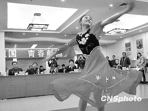 8時10分,面試開始,第一個上場的陳曉琴做了簡單的自我介紹,大屏幕顯示她抽中的問題是:如何能做一個合格的軍人。陳曉琴說,要做一名合格的軍人不但要嚴明紀律、聽從指揮,還要團結同志。接著她表演了跆拳道,并拿下了北京市女兵面試的第一個分數——26分,全部考試,陳曉琴用了8分鐘。 8時50分,來自民族大學舞蹈學院的5號應試者朱瑜上場了;卮鹆讼嚓P的問題后,她拿出了一把藍色的綢扇,跳起了一套她自編的舞蹈,婀娜的舞姿征服了全場的觀眾,也征服了9位評委,她得了28.57的高分,這個分數也是海淀考區全天考試的最高分。與她同樣得了最高分的還有清華大學的王曉麗。
