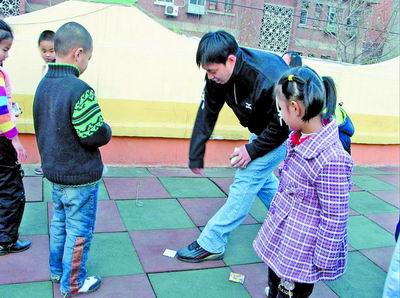 而在“玩”的時候,男女老師的不同就會顯現(xiàn)而出。據(jù)介紹,女老師一般是和孩子們玩一些如丟手絹之類活動量較小的游戲,而男老師就會帶著孩子們玩一些活動量較大的項目,比如競技賽跑等。“男老師帶的班上的孩子會比較‘瘋’,這是我們愿意看到的,孩子充滿活力是件好事。”劉明陽說。