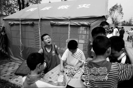 車還沒(méi)進(jìn)聚源小學(xué),谷勝聰奔下小巴,直沖校內(nèi)。這里是小學(xué)和初中一年級(jí)的臨時(shí)教室所在。昨天是初一年級(jí)的學(xué)生地震災(zāi)難后第一天復(fù)課,由于初一教學(xué)樓是原來(lái)的小學(xué)教學(xué)樓,與中學(xué)教學(xué)樓相距數(shù)公里,初一的學(xué)生毫發(fā)無(wú)損。遇難的學(xué)生全部是集中在坍塌的初中教學(xué)樓本部的,是初二、初三的學(xué)生。