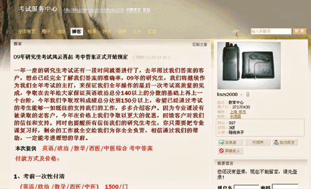 據(jù)“傳播小王子”反映,這些販賣試題的廣告不僅在各大考研論壇上蔓延,而且在QQ群、百度貼吧等處也是層出不窮,甚至有人開博客公然叫賣。而服務(wù)的種類從考前一天提供考試答案到考場(chǎng)中“在線服務(wù)”不一而足。