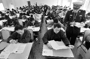 昨日早上剛到8:00,不少心急的考生已經(jīng)來到位于廣州城市職業(yè)學院廣園校區(qū)的交通協(xié)管員筆試考場。“年齡小、學歷高的并不占絕對優(yōu)勢。”交警支隊政治處副主任、昨日的副主考官張湘濤告訴記者,報名者中不乏一些大專、本科學歷的人士,還有一個碩士研究生,但無奈視力不好體檢關(guān)過不了,無緣筆試。