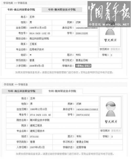 從學籍科老師處知道自己的身份可能被盜用的消息后,王帥登錄中國高等教育學生信息網查詢。他發現自己的身份下有兩個學籍信息,一個是自己2007年入學的隨州職業技術學院,另一個則顯示為:2006年9月1日入學商丘科技職業學院工程系應用電子技術專業,學制三年?,學籍狀態為已畢業。后者的姓名、出生日期、身份證等信息均與自己相同,考生號則為自己第一年參加高考的準考證號。兩個學籍信息均沒有照片。