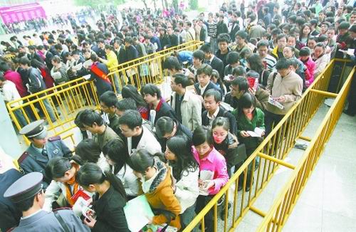 經兩天“海選”,由成都市人事局主辦、成都人才市場承辦的2008成都冬季特大型人才招聘會暨高校畢業生供需洽談會,昨日(11月16日)在世紀城新會展中心正式落幕。作為今冬規模最大的一次特大型招聘會,今年只有324家企業攜6226個崗位前來“選秀”。盡管招聘單位和崗位數量大幅縮水,但兩天時間里求職大軍數量仍逼近7萬。