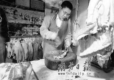 這是周日廣州龜崗市場的下午兩點鐘,大部分肉販菜販此時都生意冷清坐在位上打盹,獨獨“一號土豬”檔前吆喝聲不斷,前來買肉的師奶們絡繹不絕。