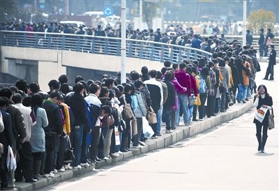 20 日,“湖北省2009年新春大型人才招聘會(huì)”在華中科技大學(xué)光谷體育館舉辦。這場(chǎng)招聘會(huì)是2009年春節(jié)后首場(chǎng)針對(duì)大學(xué)生的招聘會(huì),近4萬(wàn)名求職者擁向會(huì)場(chǎng),隊(duì)伍最長(zhǎng)時(shí)有3公里。上圖:當(dāng)天下午1時(shí)20分,一些學(xué)生投完簡(jiǎn)歷走出體育館,而門(mén)外還聚集著大量等待進(jìn)場(chǎng)的學(xué)生。