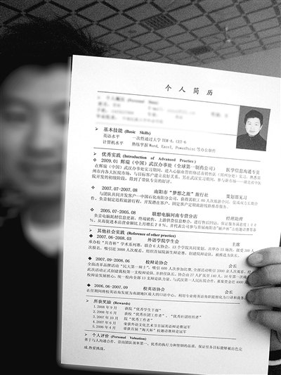 “家教、發單員……這些兼職可能都是‘大路貨’”,于是,他刪掉了這些毫無特點的經歷,并按重要程度把簡歷分層次,又將自我評價改用實例支撐。他花了兩個月,作了近70次修改,將厚厚一沓簡歷精簡到一張紙。