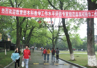各種迎評的紅幅掛在教學樓或者人行道上,每幢教學樓門口都豎著倒計時牌,標記著這是評估前的最后一天。學生會成員站在教學樓門口檢查校徽。校園110們穿著嶄新的保安制服,騎著摩托車在四處巡邏,據說為了迎評,添置了不少人手。隨便找個什么人聊天,開口閉口談的都是“評估”。連和校內的小店老板攀談,他也在說評估:“對面那家店,是為了迎評新開的……”