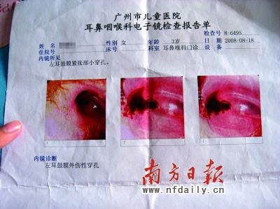 8月18日,何女士帶著耳痛未減的小賢復診,經(jīng)過電子鏡檢查,診斷為左耳鼓膜外傷性穿孔!袄锩嬉呀(jīng)破了一個口,孔里和四周充滿紅色的血漿。醫(yī)生說聽力降低了20-30分貝!焙闻恐钢瀱,一臉憂心忡忡。