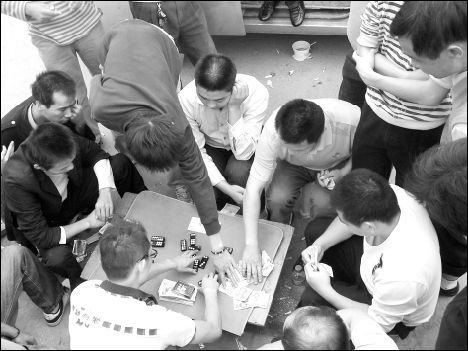 記者聞訊后來到該校門口,看到門口的路邊有20多人正圍著玩牌九。莊家洗好牌發牌后,周圍很多人都搶著下注,每手牌的輸贏都達上千元。