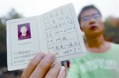 小吳的學(xué)生證上清楚地顯示出他的入學(xué)時(shí)間。記者 熊波 攝