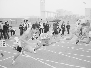 記者在現場看到,開幕式上中小學生穿著夏日服裝載歌載舞,在瀝瀝的秋雨下凍得嘴唇發烏,田徑賽場上的學生們僅穿著背心、短褲,個個被淋成落湯雞,下場后渾身凍得瑟瑟發抖。老師們則撐著雨傘為參賽學生吶喊鼓勁。