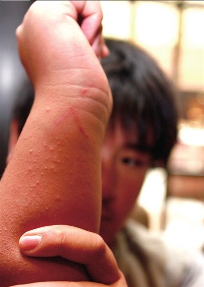楊女士說,當(dāng)天晚上她帶孩子到醫(yī)院做了檢查。記者看到病歷本上寫著“頭部、肩膀、手臂被打傷(電棍),全身多處軟組織挫傷。”記者看到,小飛的手臂、手腕處都有明顯疤痕,小飛說,這些都是被小磊用電擊器擊傷的。