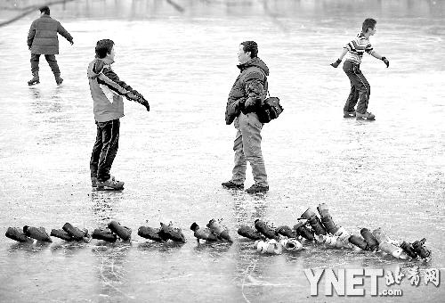 從商販處租一雙冰鞋10元錢,無(wú)需定金,沒(méi)有使用時(shí)間限制。一位坐在石椅上換冰鞋的女學(xué)生說(shuō),因?yàn)樽庑瑑r(jià)錢便宜,所以和室友一起來(lái)滑冰,覺(jué)得“應(yīng)該不會(huì)出什么安全問(wèn)題”。