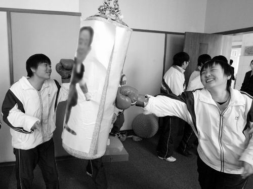 25日,記者走進陽光心靈驛站,黃色和藍色相間的墻面讓這個房間顯得格調平和而優雅。驛站由陽光工作室、心理宣泄室、心理放松室三部分組成。站內還提供了諸如宣泄皮人、臉譜、放松球、沙袋及拳擊手套等宣泄工具,配備專業教師7名。記者注意到,該校分管學生的副校長孟凡祥和3位級部主任的頭像也上了沙袋,學生們打起來毫不手軟。