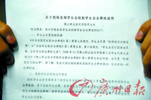 記者從該學校學生會2008年12月15日下發的一份蓋有公章的《關于收取2008~2009學年學生會會費的通知》上看到,收取會費的根據是佛山職業技術學院第三次學生代表大會通過的《佛山職業技術學院學生會章程》(修改)中的有關內容,“凡取得佛山職業技術學院學籍的在校學生,均為本會會員”、“學生會經費來源,會員在校期間交納學生會會費(每人每年20 元),由系學生會收繳,留用70%,上繳學院學生會30%。”