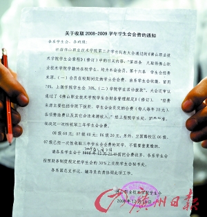 記者調查了解到,佛山職業技術學院是佛山的一所大專院校,共有十幾個專業,三年制,全校共有3000多名學生。從2007年年底,該學院的學生會要求全校學生交納學生會會費,開始時是每年交一次,一次交20 元,后來改成一次性交齊60元。三個年級三年下來收費將達18萬元。