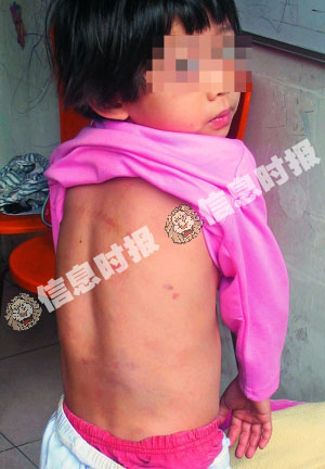 彩姐還拿出當天小晶晶被打后到醫院照的照片。記者一看,不禁嚇了一跳:小晶晶背部數處青紫,其中腰部位置的青紫有拳頭大小,還有一些地方出現紅色破皮擦傷。另外一張照片中,小晶晶的腿部數處出現條狀青紫,看得讓人心疼。彩姐說:“這些條狀傷都是他們用網球拍打的,疼得孫女好幾天晚上睡不著覺。”