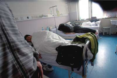 昨天下午1點,在北京市第六醫院南樓住院部4層,中央戲劇學院的患者分散在3個病房,有近20人。他們打著點滴,躺在病床上,有同學看護,學校老師也不斷查看。醫院西樓還有部分中戲患者,3人在重癥監護室。一患病男生說,他事發前一天曾吃過學校食堂的三明治。另據前來探病的女同學說:“幾乎吃了三明治的同學都被送到了醫院診治。”