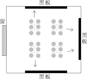 他們的教室不一般。課桌不再是傳統(tǒng)的“秧田式”,而是排成“工”字形擺放。一個“工”由6張課桌組成,一個教室大約有8組。“這樣就構(gòu)成了擁擠卻不乏溫馨的小組型學(xué)習(xí)園地,很多課堂教學(xué)任務(wù)需要一個小組去完成,在這個過程中可以培養(yǎng)學(xué)生的合作能力、自主學(xué)習(xí)能力。”劉書記指指教室四周,原來白墻的地方都安置了黑板,也就是說,一個教室至少有三面黑板。“所有的黑板用膠帶紙分隔成40厘米左右寬度的小塊,供小組內(nèi)學(xué)生板演、展示之用。數(shù)學(xué)習(xí)題、英文單詞、語文生字、古詩……內(nèi)容隨課程的交替而常換常新。”
