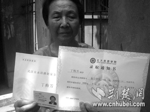 昨日(8月5日,下同)上午,家住漢口永清街趙家條的丁梅芳老太向記者展示了這封標稱“北大資源學院(以下簡稱北資院)”,在8月3日寄達的錄取通知書。記者看到,該錄取通知書上寫著:“丁梅芳同學,我校決定錄取你入數字傳媒學院系新聞傳播(本)專業(yè)學習,請持本通知書于2008年8月25日……到校報到。”