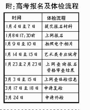2008年高考報名時間為1月18日-23日,2009年高考報名時間為1月4日-8日。省考試局稱,報名時間之所以提前,是因為今年春節(jié)來得早,教育部要求各省必須在春節(jié)前完成藝術(shù)專業(yè)統(tǒng)考工作。